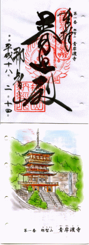 西国一番札所・青岸渡寺は天正年間豊臣秀吉により再建されたもので西国一番寺らしい重厚・風格を備えている。参拝後に本堂前の納経所で西国一番の朱印・納経をしていただく。