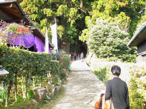 夫婦杉下から長い石段や苔むす古道を約1時間くらい登りつづけ参道に出る。那智石を使った置物や硯、碁石などを売るみやげ物店が並び店番のおばさんたちが声をかけてくる。更に進むと石段が二手に分かれ先に左の石段を上がり熊野那智大社をお参りする。那智大社と1番・青岸渡寺は境内でつながっているので土地らの石段を上がっても同じだ。