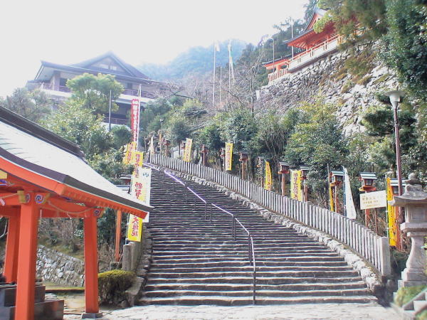 平成18年2月13〜15日西国三十三ヶ所巡拝は平成17年8月の京都・清水寺などに続き2回目になる。 2月13日(月)早朝の東京発6:05のぞみ号に乗り名古屋へ、南紀1号に乗換えて新宮駅へ11:15着。 駅から歩いて熊野速玉大社を参拝する。新宮駅に戻り勝浦へ、勝浦港からホテルの連絡船に乗り沖にある島全体が宿・中ノ島にチェックインする(泊)この船は極まれに台風などで欠航するという。 翌14日朝、又船で勝浦港へ渡り歩いて勝浦駅前、バスに乗って20分位の大門坂下で下車して西国一番札所・青岸渡寺へは世界遺産登録を果たした熊野古道を歩く。(紀伊山地の霊場と参詣道)