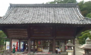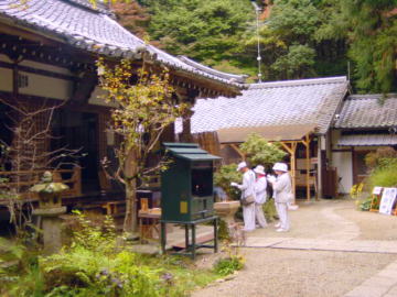 くだり坂のむこうに完璧な手入れをされた庭と大きな御堂が見える。本道横の納経所に納経帖を差し出すと西国は左に下った先と教えられる。 |