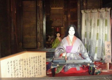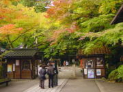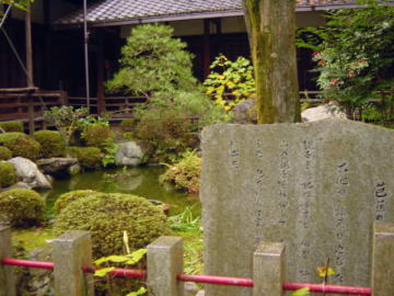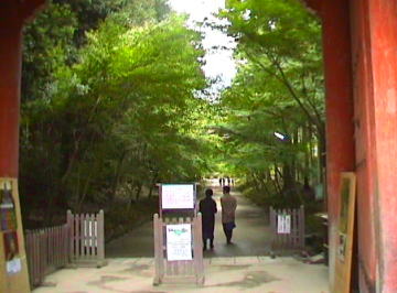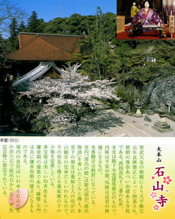 山門を入るとまっすぐ続く石畳の参道には源氏物語千年紀の催物案内が沢山表示されていた。紫式部が本堂脇 源氏の間に篭り源氏物語の須磨の巻を執筆したという。『今宵は八月十五日なりけりとおぼし出て..』 の書き出しは瀬田川の対岸に登る満月を見た折のことと寺の縁起に記されている。 |