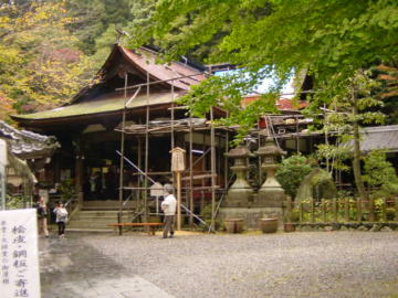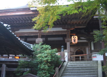 | 子守大師後ろの石段を上がると本堂の前に出る。弘法大師が嵯峨上皇の命を受け大師自ら十一面観音の胎内に熊野権現から授かった像を納め本尊とした。しかし応仁の乱で全山焦土となり唯ひとつ焼け残った奥の院の堂を移して今の本堂となっている。 |