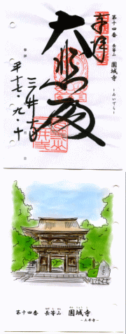 今日は一日京都の札所をお参りすることにして、7:00ホテルで朝食。 最初に向かったのは西国14番札所三井寺で京都から電車で大津駅に下車、駅員さんに三井寺への道順を尋ねる。駅からは平坦な道で住宅街の中を歩き約30分ほどで三井寺に着く。 |