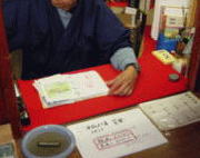 大師堂から本堂前へ進みお参りする。本堂前の納経所で朱印を授けていただく。