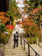 ロープウェイ山上駅から巡回バスも出ているが歩いて登る事にする。道の両側に数々の石塔を見ながらゆっくり20分ほど歩いて登ると、円教寺の石段が正面に見えてくる。 |