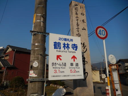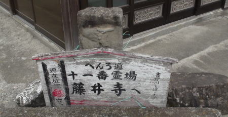 土柱ランドで朝食後十番切幡寺まで送ってもらう。切幡寺を出てすぐ広い車道の信号を渡ったとき後ろから来た乗用車が横で急停車した。びっくりして横を向くと窓から「これ食べて」とオレンジ数個を手渡される。歩き遍路にするこれがお接待だと思う。ありがとうと言うと同時にすーっと車は去っていった。お接待を受けたら納札を渡すのが礼儀だと来る前予習していたが実際に受けた直後に直ぐに実行できなかった。十一番・藤井寺へのへんろ道は吉野川の潜水橋を超えて行く。そしてお昼過ぎにはお寺に到着。名物の藤が咲くのは4月末ごろだという。お参りして本堂前のベンチで休憩していると向かいのベンチに背の高い外人さんを連れた中年日本人がいて、目が合ったので挨拶するとその人は徳島の電車の中でその外人さんと会い一緒にへんろして歩いてここまで来たそうだった。(この方とはこの後縁があり一緒に歩くことになり、静岡から一人遍路をしているので静岡さんと呼ばせてもらう)外人さんはまだ18歳でオランダから一人出来て四国遍路に興味があり挑戦する為来日したらしい。二人は言葉もほとんど伝わらないのに片言英語とジェスチャーだけで来たそうだが、親切な人だと思う。帰り一緒に藤井寺門前下へ行き広告看板前で今夜の宿など一緒に見てあげる。鴨島駅近くに行けば何とかなるのではと外人さんと二人は去っていった。うちは藤井寺から5分程下ったところにある吉野旅館で2時過ぎチェックインする。部屋は藤井寺側の角部屋で狭い部屋だが応対が手馴れた感じでゆっくり出来そうだった。お風呂は一階にあり男女別でなかなか広くゆっくり入れた。