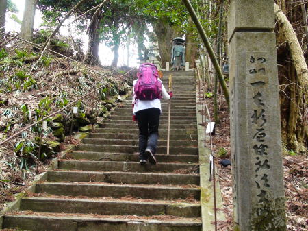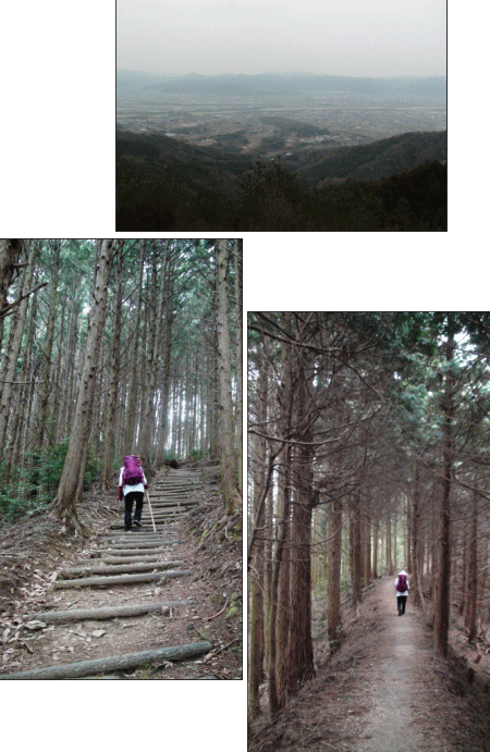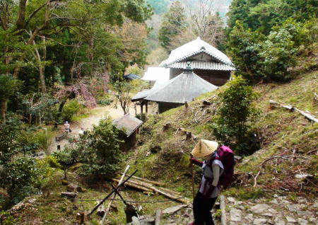 6時に宿泊者全員一緒に朝食。食後荷物を整理して衣服を整え玄関へ。宿のご主人はだいじょうぶですよというが、少し緊張しながら6:30出発する。藤井寺本堂脇から「へんろころがし」登山道に入る。健脚で6時間、弱足で8時間と言われる道、8時間ペースでいいからゆっくりあせらずに行こう。古い八十八ヶ所のほこらを右に見ながら山道に入る。鬱蒼とした林の道をしばらく登ると急に展望が開け、遠く吉野川一帯が見下ろせる雄大な景色。更に登り続け尾根つたいに歩くと最初の休憩所、長戸庵に出る。(藤井寺から所要1:30)はじめて小休止する。ここで昨夜吉野旅館で一緒だった人達数人に会う。そしてその人たちの後を追うようにゆっくり又歩き始める。山道も険しさを増して一歩一歩踏みしめながら急な登り坂を上ると下りになり何度か繰り返し息も荒くなってきた頃、林が開け「へんろころがし」中間点、柳水庵が見えてくる。(長戸庵から所要0:50)ここで湧水を補給して2度目の休憩をとる。宿で一緒の方々が先に着いて休憩中だ。皆さん数度目の遍路だというが年齢は自分達と同じかそれ以上で元気なのと健脚に感心する。中に一人外人さんがいて宿で夕食の時見かけた人だ。この方達の後についていけるだけついて行こうと又登り始める。足もだんだん重く坂道も急になってきて、杖を支えに一歩一歩登っていく。前の人達の白衣が小さく杉林の中に見え隠れして距離が遠くなって行くようで、置いていかれまいと懸命に歩を進める。何度か急な登り下りの連続の後、石段が現れ、その先の天をつく杉の巨木の下に写真でも見た、弘法大師像が大木を背にして遍路たちを迎えるように立っていた。幻想的な光景に石段を一歩一歩上りきり大師像前に出る。お遍路さんは例外なく大師像に両手を合わせることだろう。自分達も手を合わせ無事ここまでこれた事を感謝する。ここは一本杉庵・別名浄蓮庵と呼ばれている。(柳水庵から所要1:00) 焼山寺までの最後の休憩場所のようだ。巨木を囲んで木のベンチが並び先に歩いていた人たち全員も休憩中だった。しばらく腰を下ろして気持ちを引き締めて歩き始める。今度は先を歩いていた外人さんと一緒に歩き始める。そのオーストラリア人の青年は膝を痛めているようで相当きつそうだったが、気持ちは元気で、札所に来た経緯など話ながら山道を後になり先になりながら一緒に歩く。IBMの社員で日本人の奥さんと子供さんは東京に残して長期休暇をとって一人遍路に出たそうだ。再び這うような急坂、ころげ落ちるような坂を下りきると「左右内集落」に出た。そのあと急な登り坂をひたすら進むと、やっとやっと標高700b『十二番・焼山寺』が見える。(浄蓮庵から所要2:00)