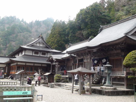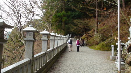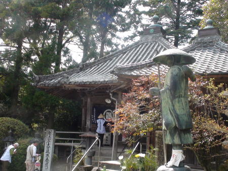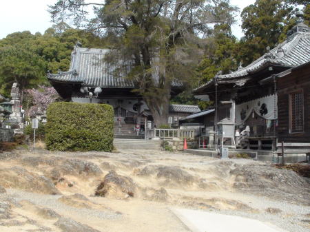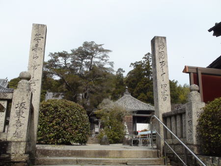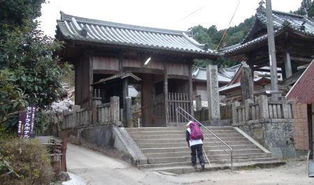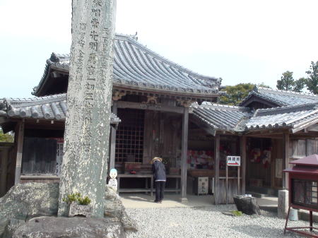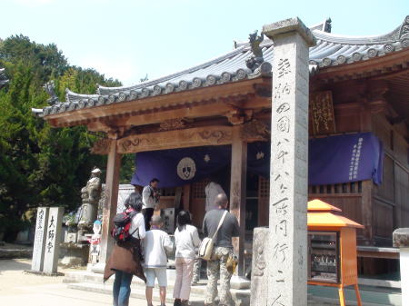 両側に石燈篭が並んだ長い参道を進むといよいよ石段の先に山門が構えている。山門で一礼し境内に入る。杉の巨木が先に見える本堂前まで続き、静寂と厳かな雰囲気が漂っている。宿を出て5時間40分。健脚の歩行時間で歩くことが出来てのは、先を歩いてくれた同宿の方々のお陰だと思う。初めての遍路ころがしの難所を二人だけで登ったらとてもこんな短時間では登れなかったろう。遍路に来る前、練習歩行では20`を超えると必ずひざに痛みのくるMだったが今のところなんともなさそうだ。本堂前でリュックをおろしてゆっくり時間をかけてお参りする。納経後、宿で用意のおむすびをいただいていると、参道をこちらに向かって来る見覚えのある二人連れ。昨日藤井寺境内で会った外人少年と日本の方だった。二人が近寄ってきて再会を喜ぶ。その後、先に到着して本堂前で休んでいたオーストラリア青年とオランダ少年が遭遇。オランダ少年もここまで一人旅ですごく不安だったろう。二人は初対面だったが英語が話せ嬉しそうに話あっている。オランダ少年と一緒に来た静岡からの方もほっとした様子。