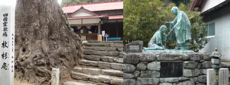 杖杉庵:四国遍路の元祖・右衛門三郎が終焉したと伝えられる地に建てられたお堂。境内から車道1.6キロほど下ったところの番外霊場。