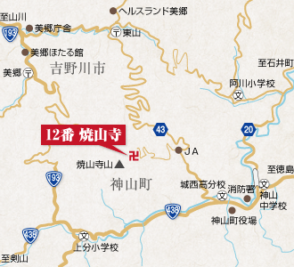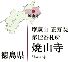 焼山寺山(標高938メートル)の8合目近くにあり、四国霊場で2番目に高い山岳札所。剣山や白髪山など四国山脈の山々がひろがる眺望はすばらしい。四国霊場には「遍路ころがし」といわれた札所がいくつかあるが、焼山寺もその一つで、昔から嶮しい坂道の難所を辿る「修行の霊場」であった。いまは山上まで車道が通っている。縁起によると、飛鳥時代に役行者が山をひらいて、蔵王権現を祀ったのが寺のはじまりとされている。ところが、この山には神通力を持った大蛇が棲んでおり、しばしば火を吐いて農作物や村人たちを襲っていた。弘仁6年ころ、弘法大師がこの地に巡られた時、一本杉で休んでいた処、阿弥陀様があらわれた夢を見た。目を覚ますと目の前が火の海になっている。そこで麓の垢取川で身を清めて山に登ると、大蛇は全山を火の海にして妨害した。大師は「摩廬(水輪の意)の印いん」を結び、真言を唱えながら進んだのだが、大蛇は山頂近くの岩窟で姿をあらわした。