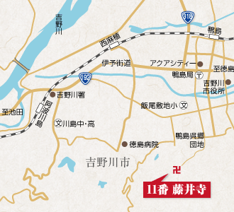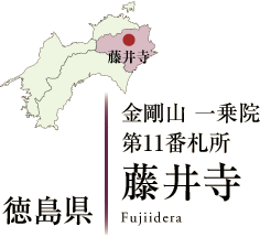 全長236キロ、四国最大の吉野川が阿波の北部を貫流している。阿波中央橋を南に渡り、およそ3キロの山麓に十一番霊場の山門が見えてくる。三方を山に囲まれ、渓流の清らかな仙境に心を惹かれた弘法大師が、この地で護摩修法をされたのは弘仁6年のことと伝えられている。大師は42歳の厄年に当たり、自らの厄難を祓い、衆生の安寧を願って薬師如来像を彫造して、堂宇を建立した。その地からおよそ200メートル上の8畳岩に、金剛不壊といわれる堅固な護摩壇を築いて、一七日間の修法をされた。その堂宇の前に5色の藤を植えたという由緒から、金剛山藤井寺と称されるようになった。