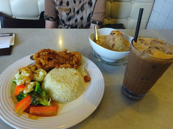 | お昼時間だったので唐揚げ定食とホワイトコーヒーをアイスで、それとカキ氷。コーヒーとても甘目だがソフトなマイルドな初めて飲むコーヒーの味。日常コーヒーをほとんど飲まないので、美味しいのかどうかは人それぞれなので不明。 |