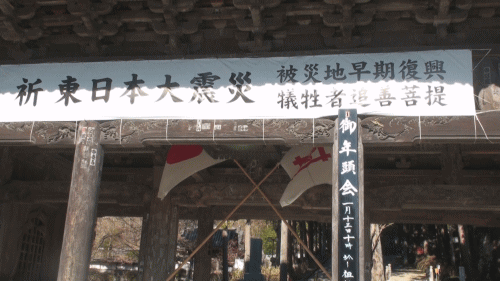 三門から本堂へと続く287段の(菩提梯)石段を上る。登り切れば涅槃に達するという意味の梯は、南無妙法蓮華経の7字になぞらえ、7区画に分けられている。 |