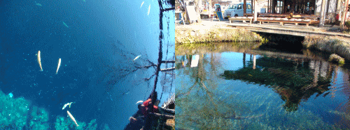 絵葉書やカレンダーなどで見かける景色がそこかしこ。 湧水の透明度はアニエスは勿論、みんなで驚嘆する。水中の魚の泳ぐ姿は水の中と思えないほどきれい。 |
