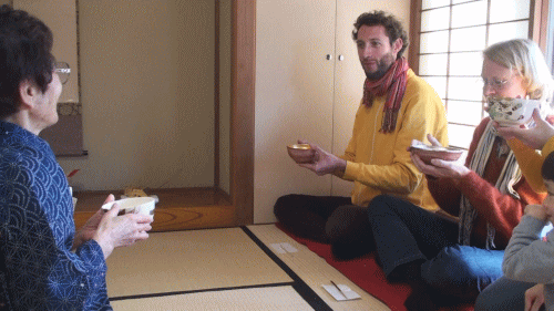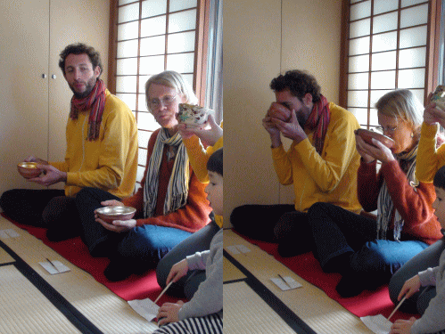 義姉からお茶席体験させてもらう。アニエスは正座ができないので胡坐のまま。 |