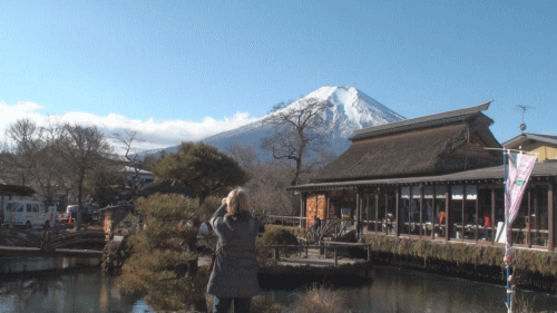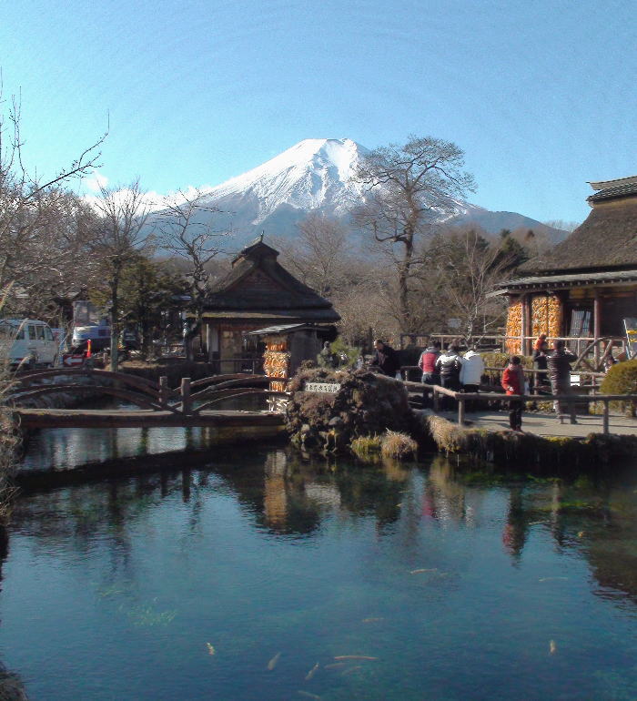 早朝出発して中央高速道路 河口湖インターをおり日本が誇る富士山周辺から。 車の運転は久しぶりで若いときに比べどうしようもなく下手、というより反射神経が鈍くなっているので運転していて怖い。しかし今回は頑張って案内するより仕方がない。 最初は忍野村観光。 |