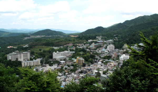 山道は緩やかな坂道で春の日差しが気持ちいい。途中の望台から有馬温泉の全景が見渡せる。 |