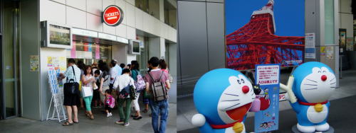 境内から見上げるタワーの写真を撮ってからタワーに戻る。夏休みでタワーの入場券売り場は沢山の人だかり。