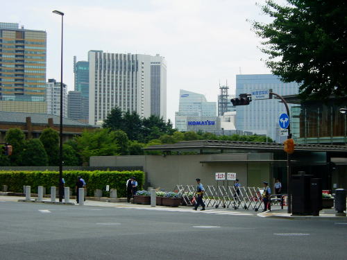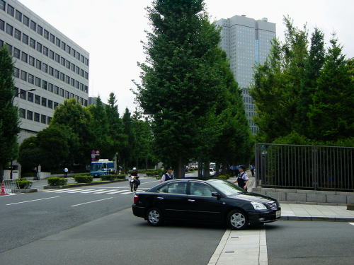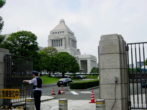 今日は参議院選挙後初の臨時国会開催日で周囲は警察車両と警察官の数がすごい。歩いているだけでも少し緊張するくらいだが、警備の警察官に今日の国会議事堂の見学方法を尋ねるととても親切にアドバイスしてくれ、それによると今日は国会が開催のため一般の見学は午後4時から裏門の見学者受付に申し込むといいそうだ、が4時までは待てないので外から見ていこうと思い正面まで行く。
