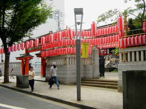 伝通院を後にして後楽園から地下鉄で乗って飯田橋駅で下車。神楽坂へ。神楽坂下から神楽坂商店街の坂道を上がって行く。7月末開催された神楽坂祭りの名残りか神楽坂通りにはちょうちん飾りがそのまま残っていて今夜にも祭りがある風情だった。 |