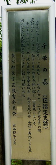 本堂脇を抜けて裏側の墓地の一角に目指す徳川家康の生母、於大の方とその曾孫で豊臣秀頼に嫁ぎ波乱の一生を終えた、家康の孫、千姫の葬られている墓地がある。歴史を生きたお二人の立派な墓石に手を合わせる。周りには徳川家ゆかりの方々の墓石が並んで建っている。