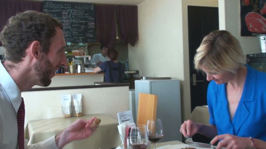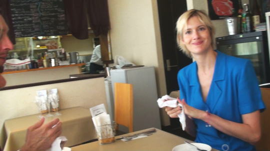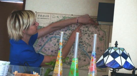 | お店のパリの地図で自分の住む場所を案内するクレール。 |