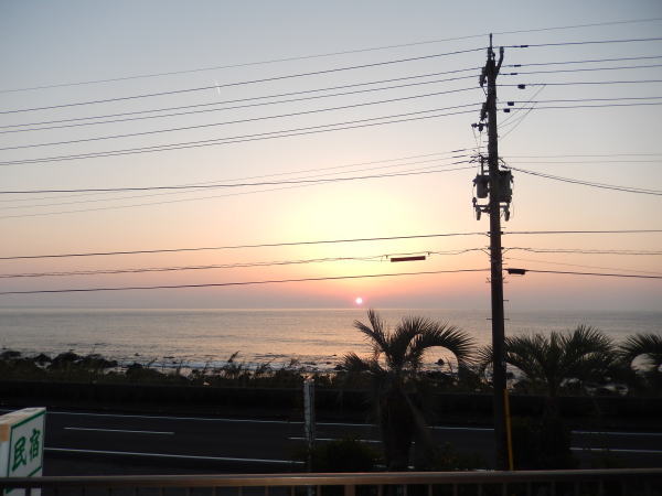 室戸市佐喜浜 遍路宿・徳増2階の部屋から見る夕陽がとてもきれい。台風銀座の海だがこの日は穏やかで波音も心地いい。