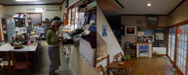 遍路宿『山茶花』には夕方6時過ぎに到着。Mは靴をぬいで、わずかな高さのあがりはなで足が上がらないほど疲れきっていた。部屋に通され倒れこむ。やっと浴衣に着替えてお風呂にはいる。天国のように気持ちいい。 お風呂から出て夕食は先に食事を済ませたお遍路さんたち数名が雑談に花が咲いていた。