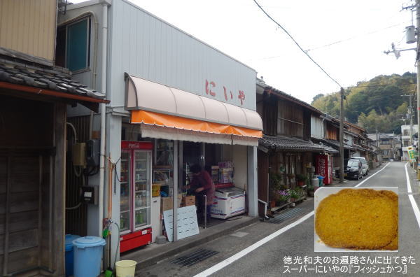 田井の浜から美波町に入って道すがら、『徳さんのお遍路さん』で徳光さんが立ち寄った「にいや食料品店」前にでる。徳光さんも放映中に食べた「フィッシュかつ」を真似て買って食べる。 たんに魚すり身のカツで味はまずまず。