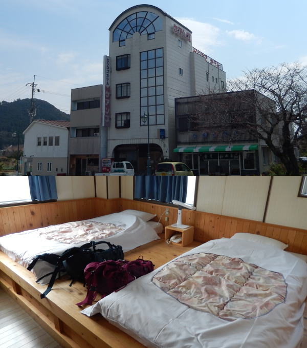 今日の宿は日和佐駅前のビジネスホテル・ケアンズ。二階の部屋にMは脚を上げ登るのがきつそうだった。
