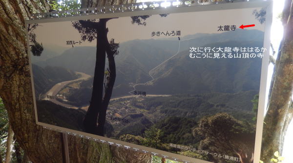 20番鶴林寺までは3キロあまりの距離だが厳しい登り山道を行く。徳島では3つの遍路ころがし(難路)がありここの登山道もその一つ。 生名を出て間もなく展望が開け案内図を見る。 最初にお参りする20番・鶴林寺の次に向かう21番・大龍寺は遥か彼方の山頂なのだ。えーっという感じ。