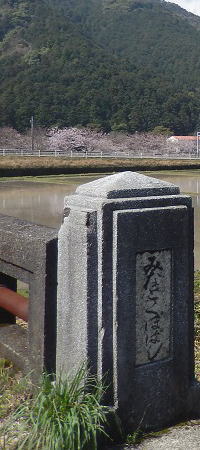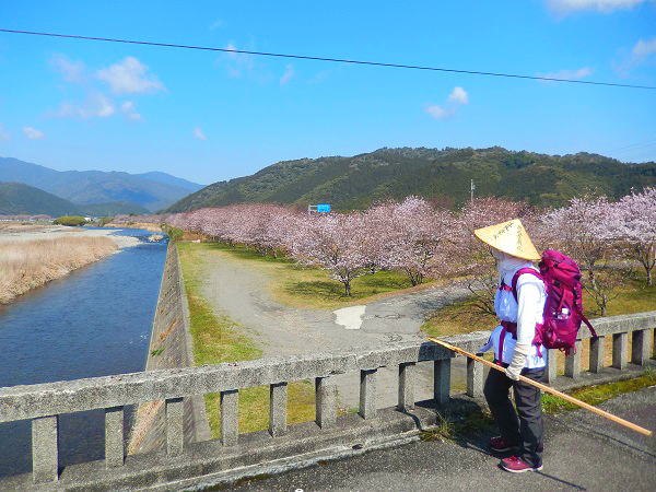番外札所明徳寺に参拝して、高知県東洋町野根の古い街並みの遍路道を進み野根川(みなとくぼばし)を渡る。川の岸辺には遥かむこうの山裾まで満開の桜が咲き誇っていた。