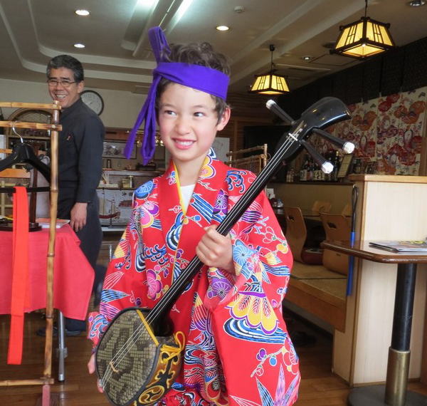琉球村の古民家・旧大城家でクレープと沖縄茶をいただきながら生の三線を聞く。