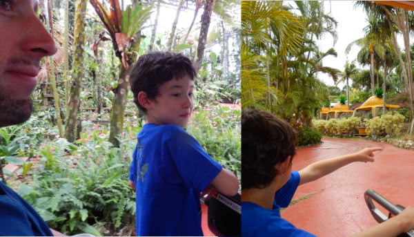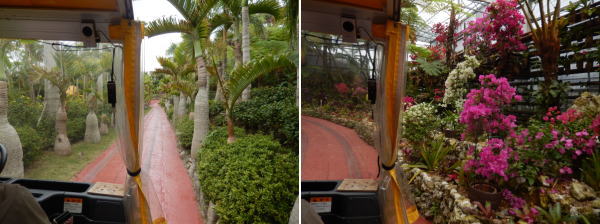 ヤシ並木やとっくりヤシのトンネル、不思議な花アナナス、ヘゴのジャングルなどトロピカルムードいっぱいの園内を一周。電動カートを降りるとパイナップル食べ放題の部屋。