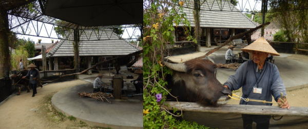 琉球牛にひかせて石臼でさとうきびを絞り黒砂糖を作っている。近づくと牛が巨体を擦り寄せて来て甘えるのが可愛いかった。