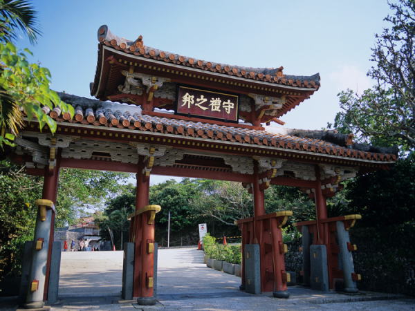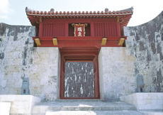 | 「守礼(しゅれい)」は「礼節を守る」という意味で、門に掲げられている扁額(へんがく)には「守■之邦(しゅれいのくに)」と書かれている。「琉球は礼節を重んずる国である」という意味である。首里城は石垣と城門の多い城であるが、中でもデザイン上バランスがとれ、エレガントな雰囲気のある代表的な門がこの「守礼門」である。中国風の牌楼(ぱいろう)という形式で建立されている。1527~55年(第二尚氏4代目尚清王代)にはじめて建立され、1933年(昭和8)に国宝に指定されたが沖縄戦で破壊された。現在の門は1958年(昭和33)に復元されたもので、2000年の記念紙幣2,000円の絵柄にもなっている。 |