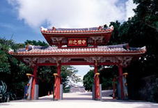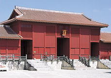 | 「神をうやまう門」という意味で、首里城正殿のある「御庭(うなー)」へ入る最後の門である。1562年には石造欄干(せきぞうらんかん)が完成したという記録があることから創建はそれ以前である。その後1754年に中国の制に倣い改修した。建物は明治末期頃に撤去されたが、1992年(平成4)に外観が復元された。現在は公園管理のための施設として利用されている。別名「君誇御門(きみほこりうじょう)」ともいう。向かって左側(北側)は「納殿(なでん)」で薬類・茶・煙草等の出納を取り扱う部屋、右側(南側)は「君誇(きみほこり)」で城内の儀式のとき等に使われた。3つの門のうち中央は国王や中国からの冊封使(さっぽうし)等限られた身分の高い人だけが通れる門である。それ以外の役人は両側の門から入城した。 |