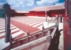 | 「御庭(うなー)」は首里城の中心部である。正面が「正殿」、向かって右(南側)が「南殿・番所(なんでん・ばんどころ)」、左(北側)が「北殿(ほくでん)」で、これらに囲まれた中庭広場の空間を「御庭」という。年間を通じて様々な儀式が行われた広場である。御庭には磚(せん)【敷き瓦】というタイル状のものが敷かれているが、この色違いの列は、儀式のさいに諸官が位の順に立ち並ぶ目印の役割をもっていた。中央の道を「浮道(うきみち)」といい、国王や中国皇帝の使者【冊封使(さっぽうし)】等限られた人だけが通ることを許された。 |