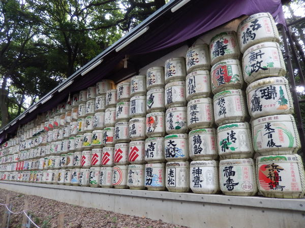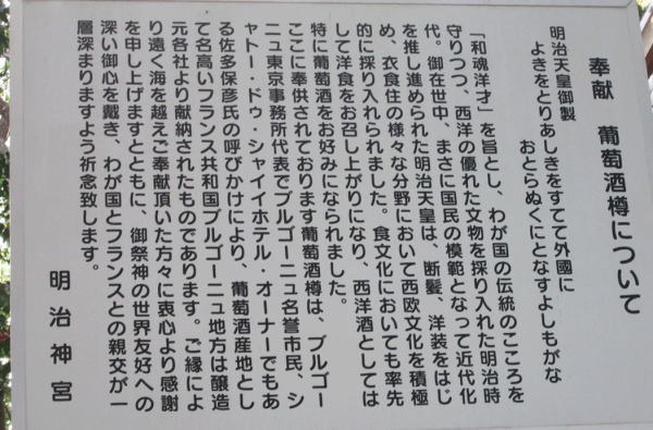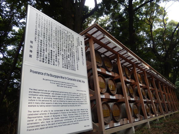 南参道を進むと右手に日本酒の酒樽(薦被り)故郷の七賢もありが懐かしい。 日本酒はお神酒でどこでも見かけるが(これほどの数量は初めて見た)、左手には樽詰めワイン。ロマネコンティなどブルゴーニュの銘酒が並ぶ。 |