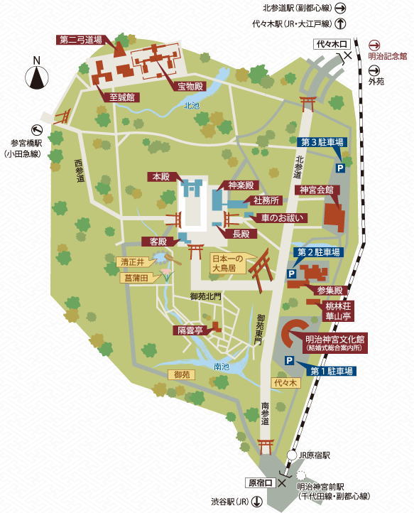 | 表参道を背に神宮橋を渡り南参道から明治神宮へ。 |