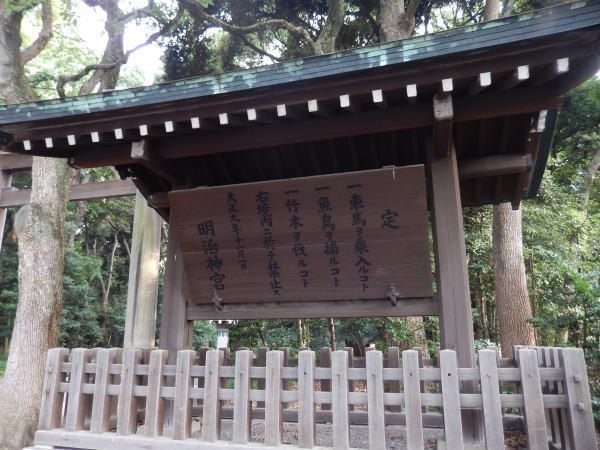 『定』の額に大正九年付で三つの約束事が書かれている。 一、車馬ヲ乗入レルコト 二、魚鳥ヲ捕ルコト 三、竹木ヲ伐ルコト 右境内ニ於テ禁止ス 大正九年十一月一日 明治神宮。 |