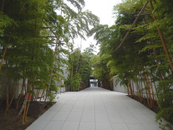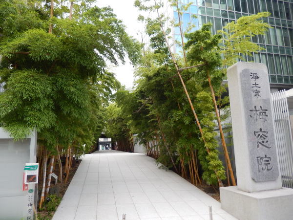 竹垣の参道の先に山門が、ビルの谷間のお寺だ。 |