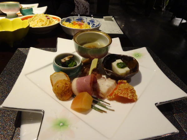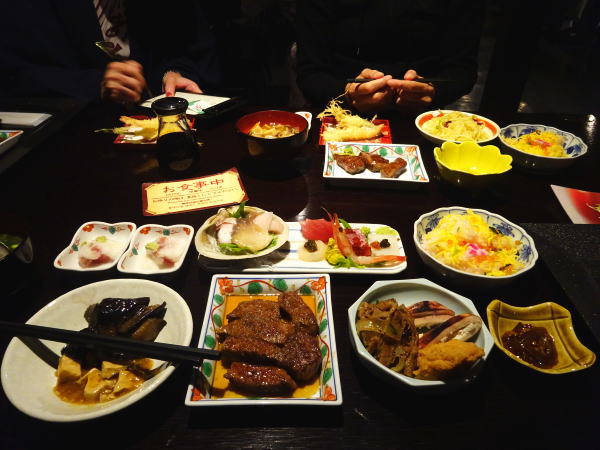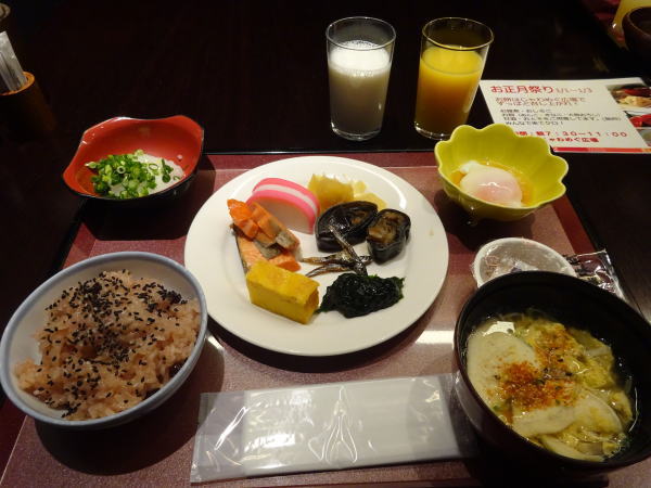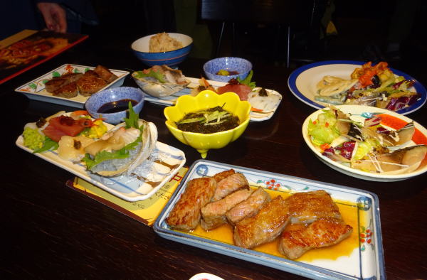 一日目大晦日の夕食時間は5時半とチェックイン時に宿で決められていた。エレベーターを降り本館の『じゃわめぐ広場』前を通り西館にあるレストラン『ぬくもり亭』へ。入口で順番に席に案内される。料理は種類も豊富でついつい食べ過ぎてしまう。目の前で焼いてくれるステーキが特に美味しく何度もおかわり。 |