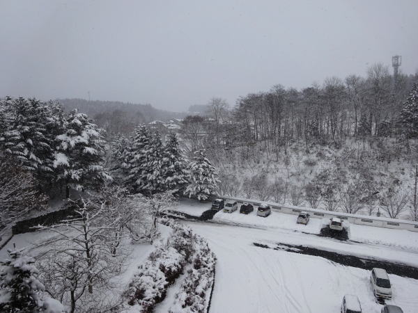 部屋に戻り年末恒例の『紅白歌合戦』を観る。今年の司会は「花子とアン」主役の吉高由里子さん。おしゃべり下手に見える彼女の司会はどんなだろうと興味があったが無難にこなして見えた。途中でお風呂に交代で行く。 窓の外は雪が降り始めた。 |