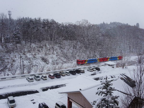 三沢方面行青い森鉄道。 部屋の窓から青い森鉄道(三沢⇔青森)電車が行き交うのが見える。 |