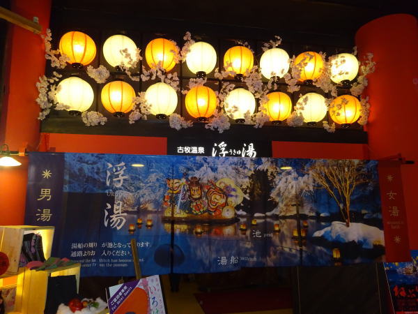 露天風呂の『浮き湯』は夜になると、冬限定ねぶり流し/灯篭流しが行われていてお風呂に浸かりながら見られる。ねぶり流しは「青森ねぶた祭り」の起源といわれている。 |