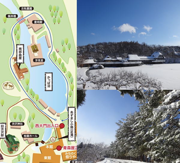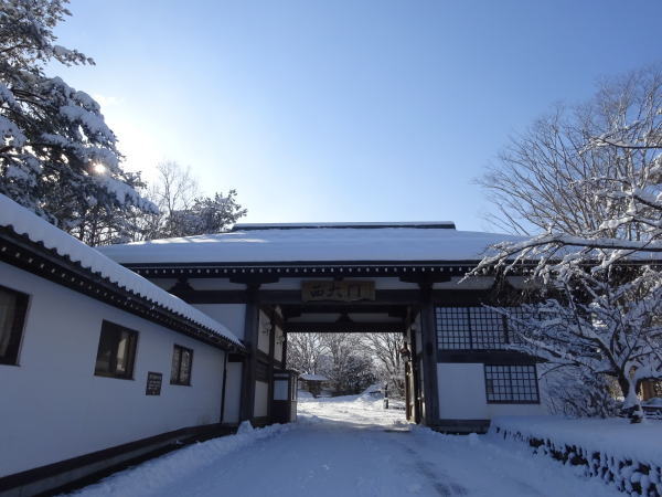雪景色の青森屋公園散策。西大門から入る。 |