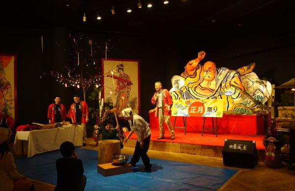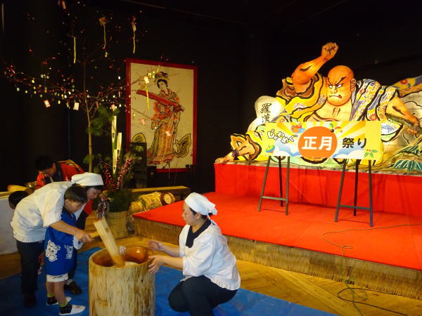 お風呂から出てくると『じゃわめぐ広場』で新年の餅つきが始まったいた。 |