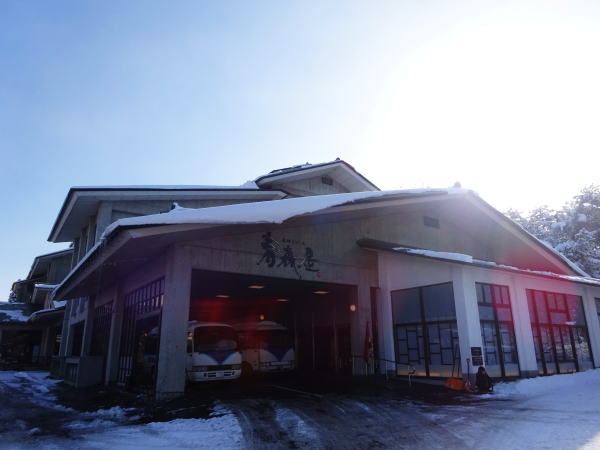 送迎バスは八戸駅から30~40分でホテルに到着。ロビーに入るとウェルカムドリンク・ホットリンゴジュースを飲みながらバスで着いた客は順番にチェックイン手続き。 |