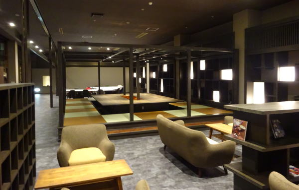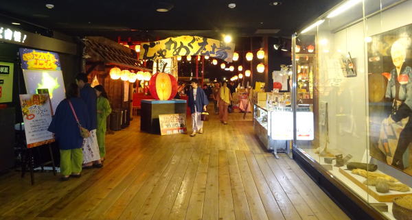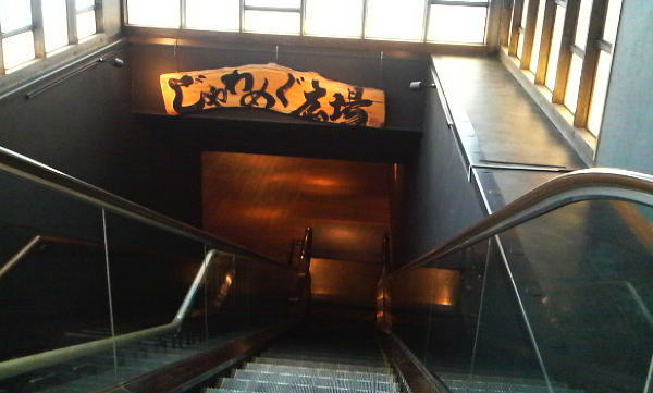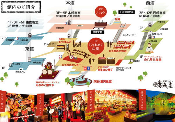 青森屋の中心『じゃわめぐ広場』は東館からエレベーターを降りフロント前を通って行く。 |